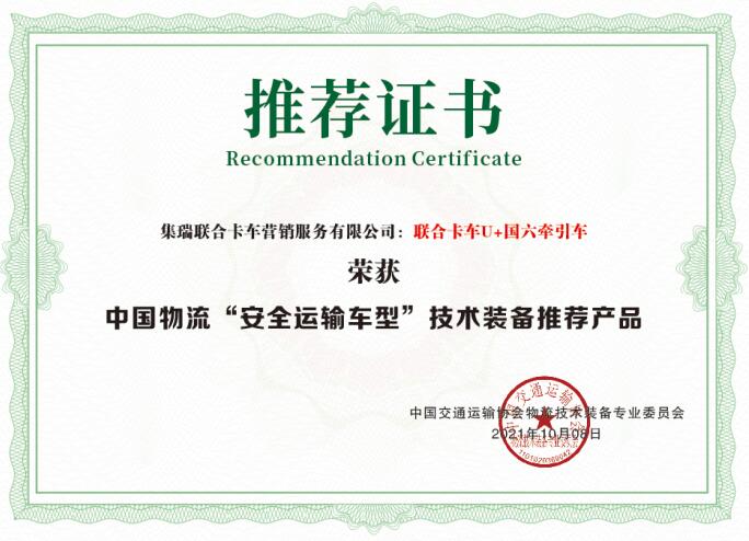 联合卡车正是中国重卡走向高质量发展的重要代表。自成立以来,联合卡车始终坚定中高端发展路线,以“为用户提供更安全、更高效重卡”为企业发展航向,多年来不断锤炼产品品质,赢得用户的百般信赖,在行业内口碑、美誉度不断攀升。也就在10月17日刚刚举办的中国智能物流技术装备大会上,联合卡车凭借问世以来展现出来的卓越安全性,获得与会嘉宾的一致认可,旗下U+国六牵引车斩获了中国物流“安全运输车型”技术装备推荐产品的殊荣!