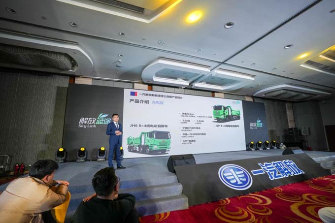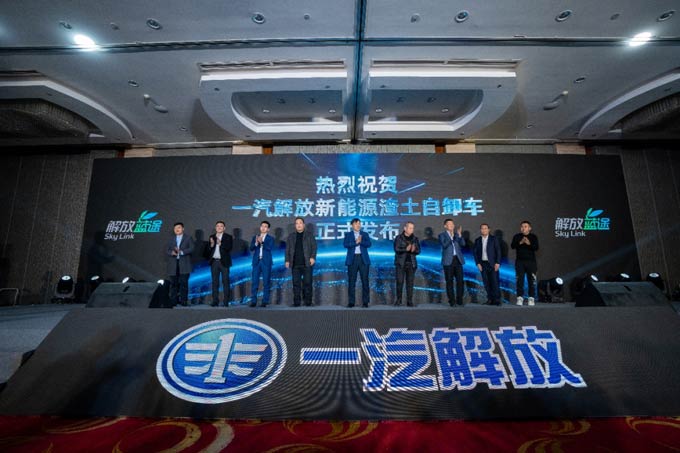 发布会现场,一汽解放副总经理季一志,一汽解放新能源事业部副总经理裴国权,一汽解放新能源事业部副总经理李玉峰以及大客户代表,共同上台启动了一汽解放新能源渣土自卸车产品发布仪式。