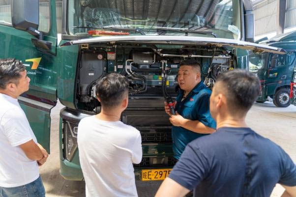随后,中国重汽服务经理为车队长提供了详尽的交车前培训,此次交付的是豪沃MAX/4×2快递燃气车型,匹配WP13NG-4.0燃气发动机,发动机扭矩达到2300NM,热效率最高可达54.16%,真正将动力强劲、经济节能做到极致;同时,车辆搭载集成式自动挡变速箱+MCY系列车桥,采用16挡精密设计,速比级差精细至1.2,确保发动机时刻处于最佳经济区间运行。交车培训过程中,双方针对发动机、变速箱、前后桥保养间隔及气瓶使用等相关问题,进行了详细的沟通和交流。