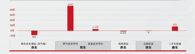 按目前油气价差平均3元计算,每公里燃料成本价差0.65元,以年运营15万公里计算,燃气车在燃料成本上可省近10万元,已完全覆盖油气车购置价差。加上无需尿素,燃气车全生命周期为用户创造价值50万元以上。