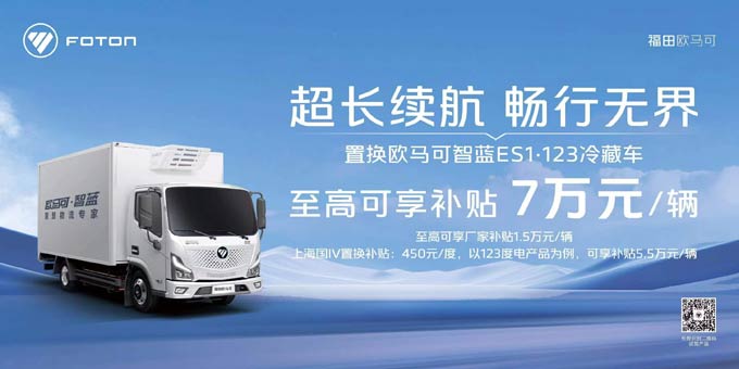 在拥有丰富产品布局的同时,欧马可智蓝纯电冷藏车不仅享受国家3.5万/辆的新购补贴,更推出重磅厂家补贴,进一步降低用户购车成本。上海区域基于450元/度的补贴政策,欧马可智蓝ES1·123冷藏车最高可享补贴5.5万元/辆,叠加1.5万元厂家补贴,最高可享补贴7万元/辆,大幅降低用户购车成本。