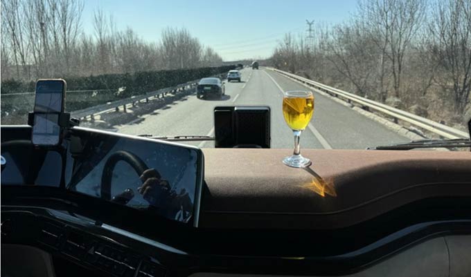 (高速行驶稳定性测试:得益于麦格纳精心调校底盘悬挂系统,欧曼银河重卡高速行驶时的平稳性令人赞叹,测试过程中,装满饮料的高脚杯不晃不洒,非一般重卡能及)