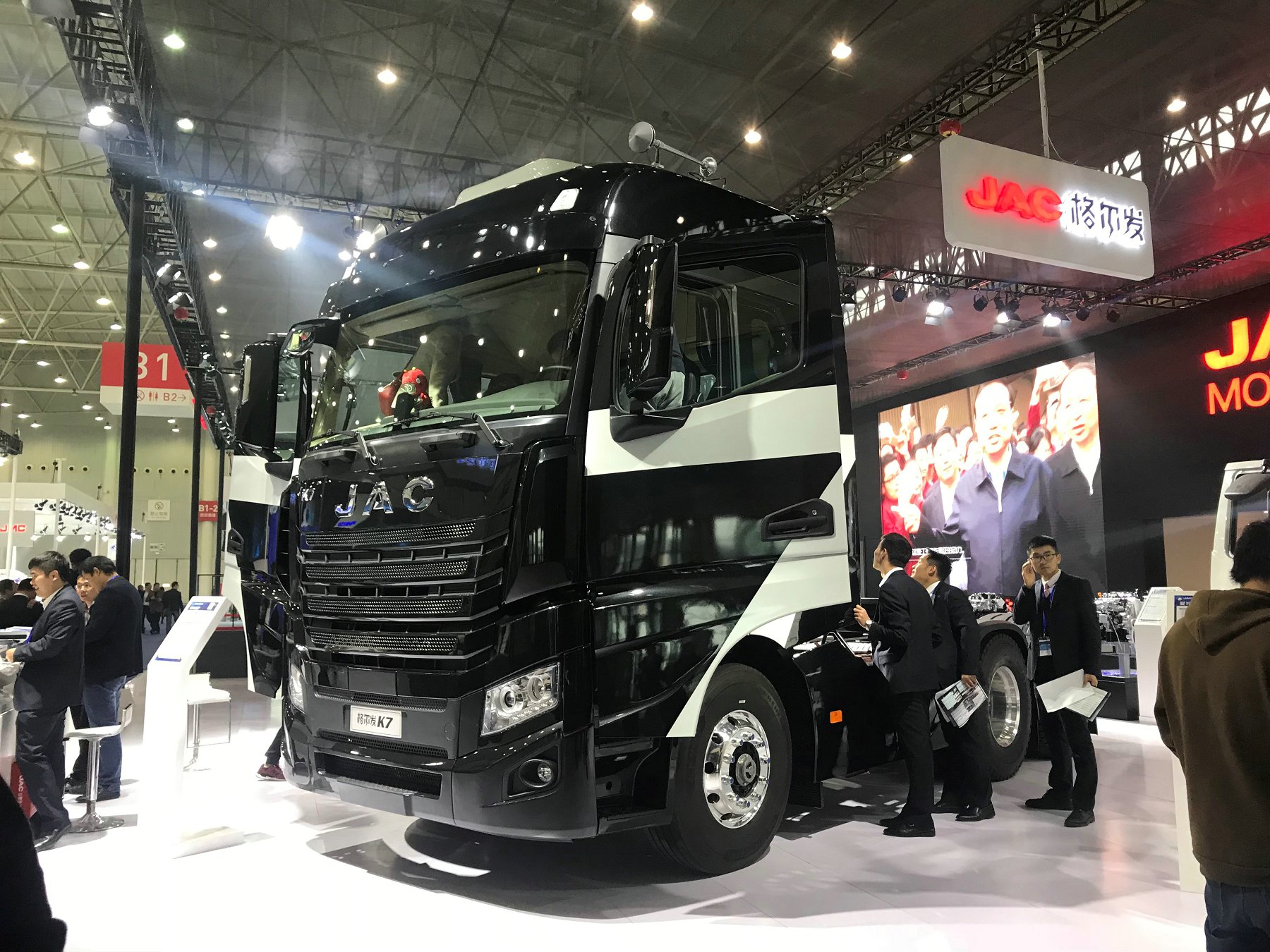 江淮格尔发K7一经亮相便引来参展观众的驻足围观,江淮格尔发K7采用全新的平台设计,硬朗大气的前脸造型,通过了国内首次重卡风洞试验的整车风阻,全浮式四气囊减震、NVH性能达国际一流水平的驾驶室、搭载车联网和一键启动的智能科技,K7生来高端,霸气掩藏不住!