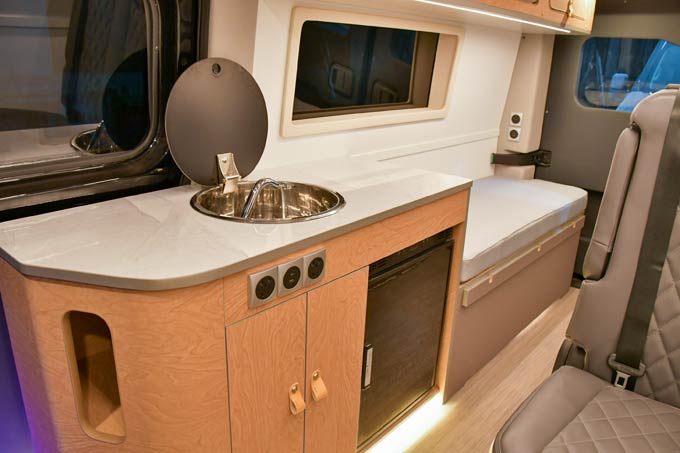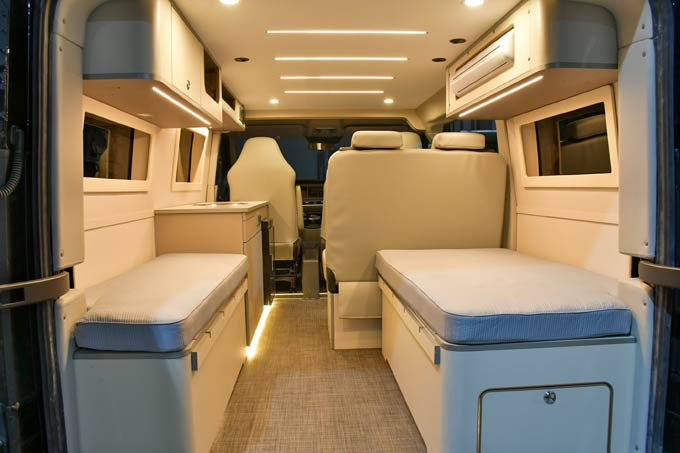 在空间布局上,先锋官V宿营车致力于在方寸之间构筑实用与舒适并存的宿营体验,得益于方正的空间设计和同级最宽的1.82m内宽带来的改装便利性,通过科学规划与精巧设计,将睡眠区、会客区、独立卫浴系统、厨房区及储物空间高效整合。配备二三排折叠座椅、座椅软包、可拆卸桌板、中门铝合金迎宾踏板、电动折叠侧踏等便利性设施,在有限的空间中创造无限可能,演绎“小空间,大生活”的智慧。