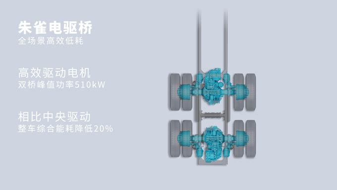 作为远程与博世联合研发的核心技术,朱雀电驱桥是星瀚G 超级电动牵引车的“性能心脏”,实现了“两降两升”:一是降自重、提载重:整车自重下降超500kg,有效运载吨位更大,直接提升运营收益;二是降能耗、升续航:通过高效电驱系统与集成式热管理系统,综合能耗较中央驱动车型降低20%,满载49吨、CHTC工况下,每公里电耗仅0.98kWh,续航能力进一步优化,在港口集装箱运输及煤炭、砂石等大宗物资运输领域,星瀚G 超级电动牵引车“降本 + 增收”的双重技术优势效应进一步放大。