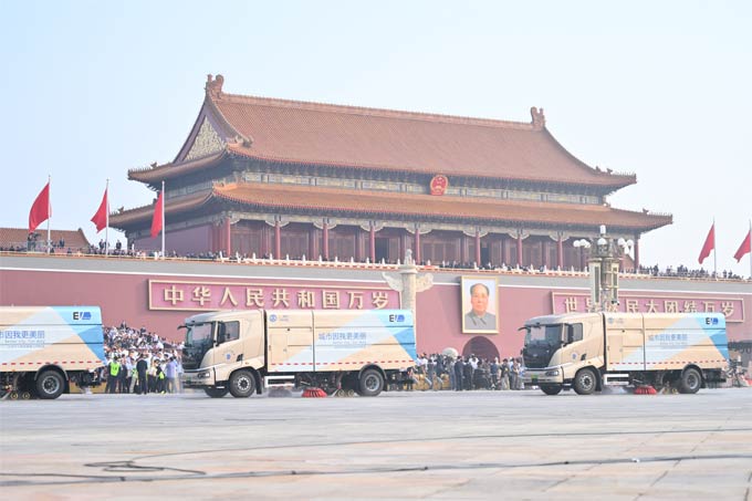 车辆所到之处,没有传统燃油车的轰鸣,只有电机运转的轻微嗡鸣。尘土与杂物被一一清除,原本就干净整洁的长安街,在它们的作业后更加一尘不染,这不仅是对盛典的致敬,更成为后续受阅方阵登场的最佳“舞台”。