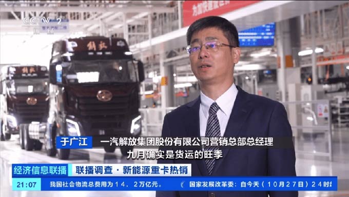 10月27日晚,央视财经栏目以《新能源重卡热销“旺季更旺” 企业满负荷生产》《出口量大幅增长 中国新能源重卡加速海外布局》为题,聚焦中国商用车企业新能源销量迅猛增长与海外布局增量提速展开报道,其中一汽解放的亮眼成绩受到关注。