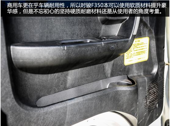 除了外形设计,在内饰设计以及人机工程学设计上,时骏F350都做了不少改变。在过去的商用车中,内饰粗犷一直被人诟病,驾乘方面更是考虑欠佳。以宽大空间以及舒适特性为卖点的时骏F350表现如何,我们接着看。