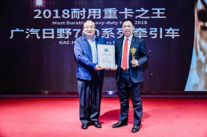 2018年12月6日,由方得网主办的“寻找车极限”活动的颁奖典礼上,广汽日野700系列牵引车经过了组委会调查组实地调查和专家团审核,被评为“2018耐用重卡之王”。