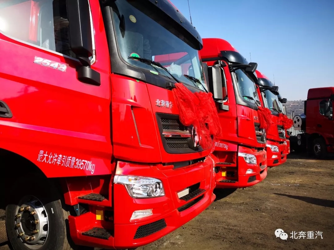1月27日,北奔重汽在吕梁鑫盛汽车销售公司院内举行V3ET(精英版)牵引交车仪式。凛冽的寒风中,威武的北奔V3ET(精英版)牵引车整装待发,即将开启属于它们的征程。