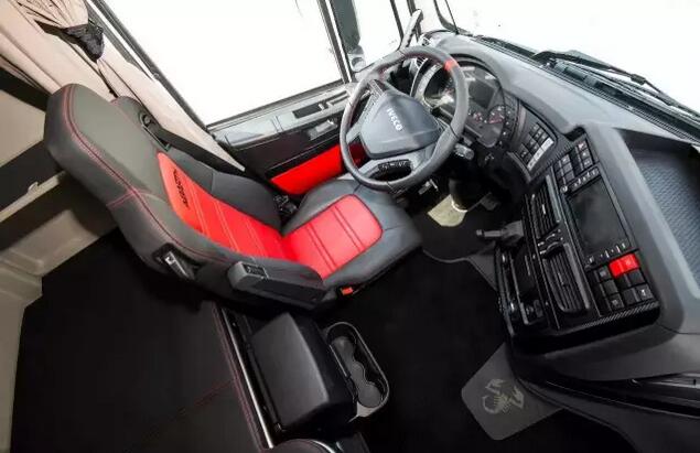这款新Stralis XP Abarth限量版卡车也属于Emotional Trucks的新成员,车辆整体为黑红白三色涂装,车门两侧都有方格旗帜图案, Abarth蝎子徽章出现在两侧车门的上方,车轮的内圈也有红色涂装。