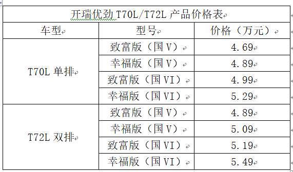 11月10日,奇瑞控股旗下商用车品牌开瑞汽车在河南开封正式发布首款后双轮大微卡——开瑞优劲T70L/T72L,开瑞汽车营销公司执行副总经理陈俊生出席现场并致辞,宣布这款为创富而生的开瑞优劲创富王正式上市,新车共有四款车型,官方指导价4.69万元-5.49万元。