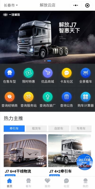 解放云店2.0对原有云店小程序商城进行了全面升级,在原有基础上,整体系统架构重组,功能全部优化提升,数据采集更精确,操作更便捷、更智能。买车前,查经销商、查货款利息、看特惠车型;买车后,查改装厂、查服务站、看备件、看精品......卡友需要的实用信息,解放云店2.0信息服务功能都可助力卡友一键解决车辆相关问题。